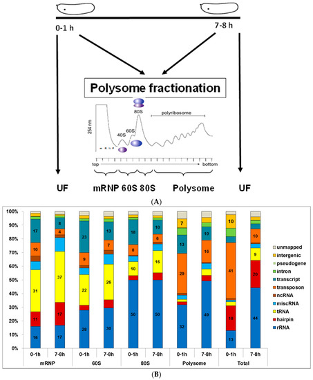 Blastoderm cellularization, which takes place between 2.5 and 3 h after fertilization in Drosophila melanogaster, is the first developmental process that requires post-MZT zygotic transcription [2]. Small RNAs play an important role in the regulation of the MZT to set the stage for post-MZT embryonic events [3,4,10]. To gain insight into the expression levels of small RNAs during MZT, we analyzed the small RNA-seq data that was previously deposited to GEO ([35], GSE35443). This data set includes small RNA-seq of 0–1 h and 7–8 h embryos. Half of these embryos were used to isolate total RNAs from unfractionated embryos (Figure 1A, un-fractionated (UF)) as a reference. The other halves were then fractionated, on sucrose density gradients (SDGs), into 4 major sub-fractions based on A254 absorbance: (1) mRNPs devoid of rRNAs, (2) 60S, containing 28S rRNA, (3) monosome, and (4) polysome. Here we report the comparative analysis of dynamic changes that we have observed in the intracytoplasmic localization of all small RNAs during early development in Drosophila melanogaster.