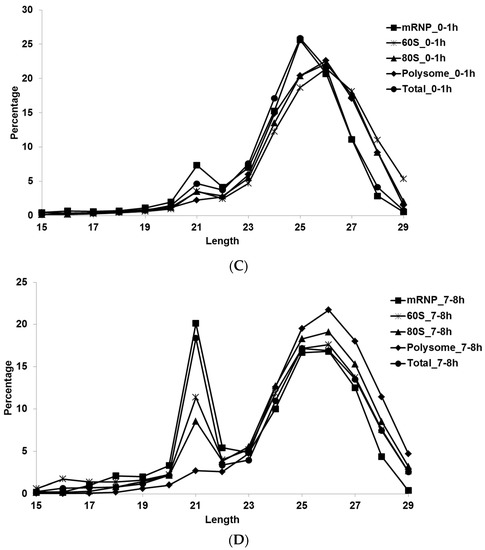 One major concern in polysome profiling is the potential for a greater RNA degradation during sample processing prior to downstream events. Thus, we first checked the RNA quality of total RNAs and small RNAs using Agilent RNA 6000 Nano kit and Agilent Small RNA kit, respectively (Agilent, Santa Clara, CA, USA) (Figure S1). Total RNA capillary electrophoresis verified high quality of RNAs phenol-extracted from fractions [35]. Interestingly, each fraction appears to possess a unique small RNA profile especially based on small RNAs that are smaller than tRNAs. When we calculated the frequency of deep-sequencing reads based on the read size, a great majority (88.8–99.5%) of adaptor-containing reads contained inserts of 15–29 bp in size, further verifying a high quality of input RNA. The low percentage of 0–14-bp inserts in fractionated RNAs, compared to that in unfractionated total RNAs, was consistent with the high quality of fractionated RNAs (Table S1). Interestingly, 1 h total RNA contained the greatest percentage of 0–14 bp inserts, congruous with the destabilization of maternal mRNAs [2]. Of the 12,553,921 total reads, 71.95% of the fragments matched perfectly to the Drosophila melanogaster genome with a number of unique sequences in each sample ranging from 71,830 to 757,803. Based on the relative length distribution, we observed enrichment in 22–28-bp RNAs (Figure S2).
