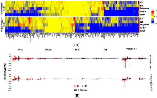 The Clustering of transposon-derived transcripts. (A) The reads were first aligned to the Repbase collection [40], all reads and uniquely mapped reads were used to calculate the transcript expression levels. Then the log2 fold change was calculated and clustered as in Figure 2A; (B) The reads that are mapped to one of the most abundant transposon cluster in Drosophila melanogaster, 42AB.