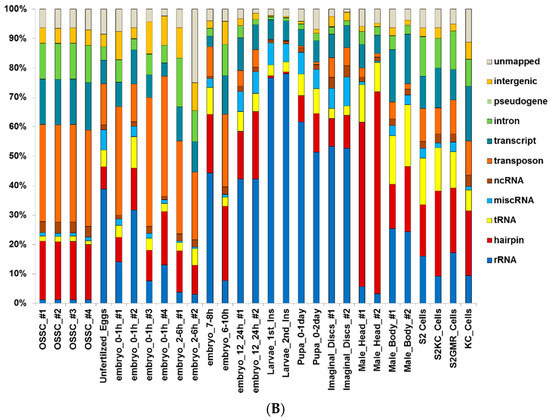 Analysis of small RNA abundance in various developmental stages. (A) The percentage of transposon-derived small RNAs; (B) The small RNAs aligned to know RNAs as in Figure 1B for all datasets downloaded from GEO with the following GEO numbers; OSSC_#1:GSM385744, OSSC_#2:GSM385748, OSSC_#3:GSM385821, OSSC_#4:GSM385822, Unfertilzed_Eggs:GSM1550732, embryo_0–1h_#1:GSM180330, embryo_0–1h_#2:GSM286604, embryo_0–1h_#3:GSM286613, embryo_0–1h_#4:GSM868349, embryo_2–6h_#1:GSM180331, embryo_2–6h_#2:GSM286606, embryo_7–8h:GSM868350, embryo_6–10h:GSM180332, embryo_12–24h_#1:GSM180333, embryo_12–24h_#2:GSM364902, Larvae_1st_Ins:GSM360256, Larvae_2nd_Ins:GSM360257, Pupa_0–1day:GSM360260, Pupa_0–2day:GSM360262, Imaginal_Discs_#1:GSM180335, Imaginal_Discs_#2:GSM275691, Male_Head_#1:GSM180328, Male_Head_#2:GSM286601, Male_Body_#2:GSM180329, Male_Body_#2:GSM286602, S2 Cells:GSM180337, S2KC_Cells:GSM272651, S2GMR_Cells:GSM272652, KC_Cells:GSM272653. OSSC: Ovary Somatic Sheet (OSS) cell line. We numbered datasets (#) if they are the same time points. We only used 15–29 nt inserts.