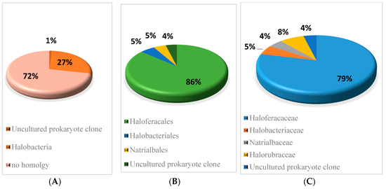 The sequence conservation of the sRNAs predicted in H. mediterranei was analysed using BLASTn [25], comparing each sequence to all sequenced archaeal genomes (E value 10 × 10−6). Only hits with a nucleotide identity higher than 60% combined with a coverage between the query and subject sequence higher than 80% were considered as conserved. The results of homology are shown in Figure 2 and Table S7. It was found that 27% of verified sRNAs present conserved sequences in other Halobacteria, mainly in the Haloferacales order (86%) and Haloferacaceae family (79%). The remaining 63 sRNAs showed no sequence homology with any other Archaea.