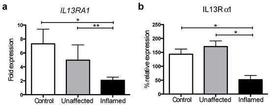 Interleukin-13 receptor α-1 (IL13RA1 (gene) and IL13Rα1 (protein)) expression is dysregulated in ulcerative colitis (UC): (a) Bar graph depicting the mRNA expression of IL13RA1 in colonic biopsies from non-UC patients (Control), unaffected tissue (Unaffected) and their matched inflamed colonic tissue samples taken from the same patient (Inflamed) relative to Control (n = 11 on each group); and (b) Bar graph depicting the relative expression of IL13Rα1 protein in colonic biopsies from non-UC patients (Control), unaffected tissue (Unaffected) and their matched inflamed colonic tissue samples taken from the same patient (Inflamed) relative to Control (n = 6 for each group). Data were first assessed for normality employing a D’Agostino and Pearson omnibus test when possible. Statistics were then done employing two-sided t-tests for non-parametric data (paired or unpaired): two-sided Mann–Whitney U-tests for non-paired datasets and Wilcoxon matched-pairs signed rank test for paired non-parametric data. Represented are mean + standard error of the mean. *: p-value ≤ 0.05; **: p-value ≤ 0.01.