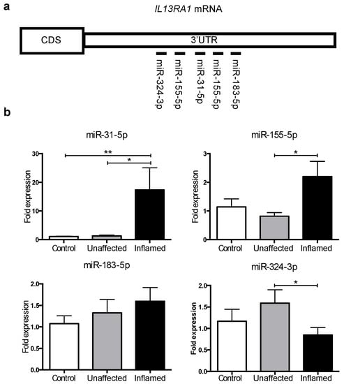 MicroRNAs predicted to target IL13RA1 mRNA expression levels in UC colonic biopsies: (a) Schematic of the 3′UTR of IL13RA1 mRNA representing the approximate locations for predicted (validated for miR-155) miR binding sites (Table S1); and (b) Bar graphs depicting the expression levels of miR-31-5p, miR-155-5p, miR-183-5p and miR-324-3p in colonic biopsies from non-UC patients (Control), unaffected tissue (Unaffected) and their matched inflamed colonic tissue samples taken from the same patient (Inflamed) (n = 7 on each group) relative to Control. Represented are mean + standard error of the mean. Data were normalised to expression of small nucleolar RNA C/D Box 44 (RNU44) prior to performing one-sided t-tests (paired for Unaffected vs. Inflamed or unpaired when comparing against Control). *: p-value ≤ 0.05; **: p-value ≤ 0.01.