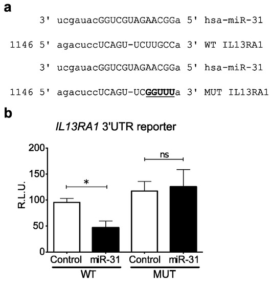 MicroRNA-31 directly binds and targets the 3′UTR of IL13RA1 mRNA: (a) Schematic depicting the predicted binding site for miR-31 in the 3′UTR of IL13RA1 mRNA (WT) and the generated mutant version (MUT); and (b) Bar graph showing the effects of over expressing miR-31 on the enzymatic activity of the Luciferase reporter generated for the predicted binding site and its mutant version. Co-transfection of miR-31 with the WT and MUT reporters in HeLa cells determined that miR-31 was able to significantly decrease the activity in the WT reporter only. Statistics were done employing a paired two-tailed t-test. Represented are mean + standard error of the mean R.L.U.: Relative luminescence units. *: p-value ≤ 0.05.