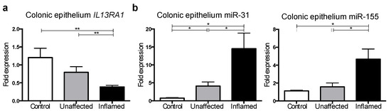 Interleukin-13 receptor α-1, miR-31 and miR-155 expression in primary gut epithelial cells: (a) Expression levels of IL13RA1 mRNA in colonic epithelial cells extracted from patients gut biopsies from non-UC patients (Control), unaffected tissue (Unaffected) and their matched inflamed colonic tissue samples taken from the same patient (Inflamed) relative to Control (n = 5 on each group); and (b) miR-31 and miR-155 expression levels in gut epithelial cells isolated from biopsies taken from non-UC patients (Control, n = 3), unaffected tissue (Unaffected, n = 5) and their matched inflamed colonic tissue samples taken from the same patient (Inflamed, n = 5) relative to Control. Represented are mean + standard error of the mean. *: p-value ≤ 0.05; **: p-value ≤ 0.01.