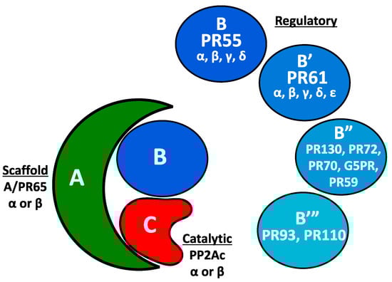 Protein phosphorylation is an essential regulator of many cellular processes, including metabolism, transcription, proliferation, cell motility, and apoptosis [,]. Nearly 30% of all human proteins are covalently bound to a phosphate—a feat made possible by the 500+ different protein kinases encoded by the human genome []. Protein phosphatases make these modifications reversible, and the serine-threonine protein phosphatase 2A (PP2A) accounts for 30–50% of these protein dephosphorylation events [,]. PP2A is a heterotrimeric protein complex consisting of a structural (A), a regulatory (B), and a catalytic subunit (C) []. There are two unique scaffolding isoforms (Aα and Aβ), two unique catalytic subunit isoforms (cα and cβ), and four structurally diverse families of regulatory (B) subunits that are referred to by a variety of naming conventions: B (or PR55), B’ (PR56/61), B” (PR72/130), and B’” (PR93/110). As shown in Figure 1, Greek letters further identify individual regulatory subunit isoforms of the B and B’ family. These subunits determine the substrate specificity and subcellular localization of PP2A heterotrimers [,]. The precision with which PP2A regulatory subunits target individual phospho-residues was established by early studies on the phosphorylation of Simian virus 40 (SV40) large T antigen. A holoenzyme with a B/PR55 family regulatory subunit dephosphorylates Thr124 of the SV40 large T antigen, while a PP2A complex with the B”/PR72 regulatory subunit dephosphorylates Ser120 and Ser123 []. The targeting specificity of the regulatory subunits allows a small pool of protein phosphatases to regulate numerous phosphoproteins with enhanced precision []. While individual regulatory subunits provide precision, the diversity of subunits also allows for the regulation of a variety of substrates.