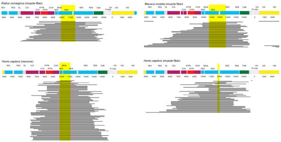 - Guo, X.; Popadin, K.Y.; Markuzon, N.; Orlov, Y.L.; Kraytsberg, Y.; Krishnan, K.J.; Zsurka, G.; Turnbull, D.M.; Kunz, W.S.; Khrapko, K. Repeats, longevity and the sources of mtDNA deletions: Evidence from ‘deletional spectra’. Trends Genet. 2010, 26, 340–343. [Google Scholar] [CrossRef] [PubMed]