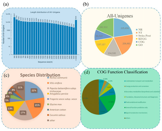 Characteristics of unigenes generated by Illumina sequencing. (a) The length distribution of all assembled unigenes. (b) The number of unigenes annotated by different databases, including NR, NT, Swiss-Prot, KEGG, COG, and GO. (c) Species distribution of the top BLAST hits for all homologous sequences. (d) COG function classification of all unigenes. NR: Non-redundant; NT: Nucleotide; KEGG: Kyoto Encyclopedia of Genes and Genomes; COG: Clusters of Orthologous Groups; GO: Gene Ontology.