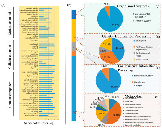 Gene Ontology and KEGG terms assignment of okra unigenes. (a) A total of 182,513 unigenes were assigned to different GO terms. (b) A total of 137,117 unigenes were assigned to different KEGG terms. Different color blocks represent different terms, from top to down, “Organismal Systems”, “Genetic Information Processing”, “Environmental Information Processing”, “Cellular Processes” and “Metabolism”. Proportion of unigenes in each second level term in “Organismal Systems” (c), “Genetic Information Processing” (d), “Environmental Information Processing” (e), and “Metabolism” (f).