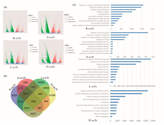 Overview of the DEGs among five different organs in okra. (a) DEGs in different comparisons, including R vs. Fr, S vs. Fr, L vs. Fr, and Fl vs. Fr, are showed by volcanic map. (b) Venn diagrams of the DEGs in the four different comparisons. (c) GO classification of DEGs in the four different comparisons. From top to down, R vs. Fr comparison, S vs. Fr comparison, L vs. Fr comparison and Fl vs. Fr comparison. R: root; S: stem; L: leaf; Fl: flower; Fr: Fruit.