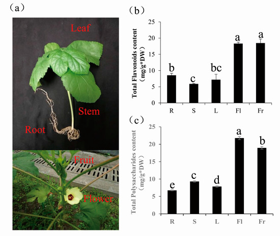 The contents of total flavonoids and polysaccharides were determined in all five organs, namely R, S, L, Fl, and Fr, with significant differences in contents being observed between the different organs for both components (Figure 5). Total flavonoids and polysaccharides were mainly concentrated in flowers and fruits (Figure 5b,c). The highest content of total flavonoids was 18.49 mg g−1 for fruits, and the highest content of polysaccharides was 21.76 mg g−1 for flowers. Using the transcriptome data from the five organs, we explored the molecular mechanism behind of the organ-specific distribution in the active components in okra.
