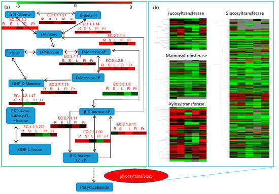 The genes encoding three enzymes, (guanosine diphosphate) GDP-L-fucose synthase (EC: 1.1.1.271), Guanosine diphosphate-mannose 4,6-dehydratase (EC: 4.2.1.47), and phosphomannomutase (EC: 5.4.2.8), were more highly expressed in fruits than in any other okra organs. The biosynthesis of glycan and glycosides requires the participation of glycosyltransferase (GTs; EC: 2.4.x.y) enzymes, which are an important and a very widespread group of enzymes in higher plants [36]. Based on BLASTX [37] comparison of the five transcriptomes, a total of 970 unigenes were annotated to GT genes, consisting of 44 fucosyltransferase genes, 184 mannosyltransferase genes, 104 xylosyltransferase genes, and 638 glucosyltransferase genes. The expression patterns of GT genes were exhibited as a heat map performed by the MeV tool (Figure 7b). The expression levels of four family’s genes were listed in Table S8.