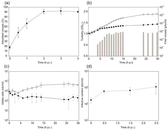 Approximately 90% of HHPV4 particles adsorbed to H. hispanica cells at 2 h p.i. (Figure 2a). The adsorption rate constant was 1.7 × 10−12 mL/min for the first 30 min p.i. In the optimized virus life cycle experiment, MOI of 15 was used to infect H. hispanica culture when optical density (OD550) was ~1.0. The highest increase in the production of free progeny viruses was observed starting from 4 h p.i. (Figure 2b). At the same time, the growth rate of the infected culture started to decline based on the turbidity measurements. At 8 h p.i., a stable production of ~1011 pfu/mL was reached (Figure 2b). The number of viable cells started to diverge between the control and the infected cultures starting at 6 h p.i. (Figure 2c), after which the viable cells in the infected culture reached the concentration of ~108 cfu/mL for the rest of the measurements, while, in the control, the numbers increased and remained above 109 cfu/mL. The number of infective centres reached ~109 pfu/mL at 2.5 h p.i., indicating that a high number of host cells were infected by HHPV4 (Figure 2d).