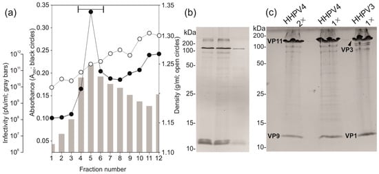 Viruses were purified by a two-step (1× and 2× purification) sucrose gradient purification protocol, as described in Materials and Methods. Virus purification resulted in highly-pure infectious particles with a yield of up to 15% (Table S1). After 2× purification, the highest concentration of infectious viruses was observed at a density of ~1.27 g/mL (sucrose) in line with the absorbance peak (Figure 3a). The calculated specific infectivity of HHPV4 was ~4.9 × 1013 pfu/mg of protein indicating high purity and stable integrity of the pure virions. The protein profile of the HHPV2 virions was simple (Figure 3b), which was found to be very similar to that of the HHPV3 virus (Figure 3c) []. The two major structural proteins of HHPV4, designated as VP9 (VP for virion protein; ~120 kDa) and VP11 (~13 kDa) (see below), correspond to the HHPV3 proteins VP1 and VP3, respectively (Figure 3c).