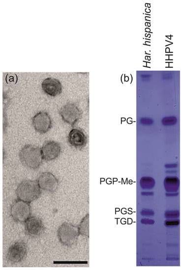 HHPV4 virion and its lipids. (a) Transmission electron microscopy (TEM) micrograph of the 2× purified HHPV4 particles negatively stained with 1% ammonium molybdate. Scale bar equals 100 nm; (b) Thin-layer chromatogram of lipids extracted from H. hispanica cells and 2× purified HHPV4 particles. The major lipid species of H. hispanica [] are indicated on the left: PG, phosphatidylglycerol; PGP-Me, phosphatidylglycerophosphate methyl ester; PGS, phosphatidylglycerosulfate; TGD, triglycosyl glycerodiether.