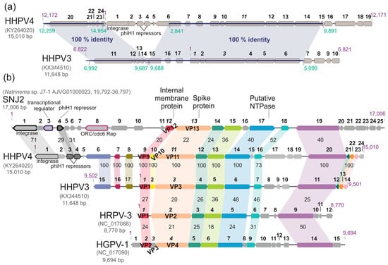 Comparison of genomes of betapleolipoviruses. All genomes are circular double stranded (ds) DNA molecules, which are shown as linearized molecules. Open reading frames (ORFs) or genes are represented as grey arrows and are numbered (gene numbers are italicized). GenBank accession numbers are indicated in brackets, and the total length of genome sequences is marked under virus name. Nucleotide coordinates are shown in purple. (a) Comparison of HHPV4 and HHPV3 genomes. The regions of 100% nucleotide identity are marked with blue, and nucleotide coordinates of the identical regions are shown in dark green; (b) All known betapleolipovirus genomes are compared. Virion proteins (VPs) are marked. Similar ORFs or genes are in the same colours. Amino acid identities (%) between (putative) proteins are shown in between the genomes. HRPV-3, Halorubrum pleomorphic virus 3; HGPV-1, Halogeometricum pleomorphic virus 1.