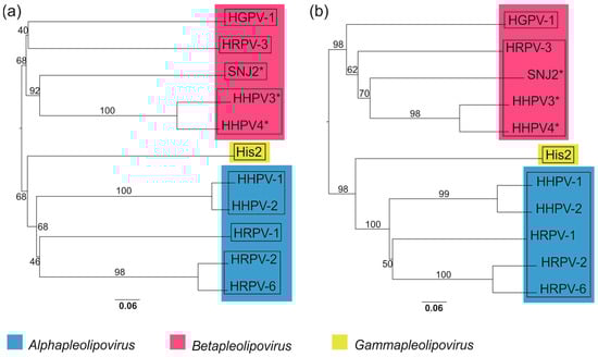 The Genome BLAST Distance Phylogeny (GBDP)-based phylogenomic trees of the complete genome sequences of the pleolipoviruses yielded average support of ~76% and ~84% at the nucleotide and amino acid levels, respectively (Figure 6a,b). Both trees have two major branches comprising viruses that are currently classified as alphapleolipoviruses and gammapleolipovirus (lower branch, Figure 6a,b) and betapleolipoviruses (upper branch, Figure 6a,b) by the ICTV. As expected, HHPV4 clusters with betapleolipoviruses and most closely with HHPV3.