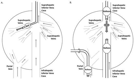 Open procedure model (left panel): catheterization was carried out through the jugular vein with an 8 Fr balloon catheter placed in a suprahepatic branch.