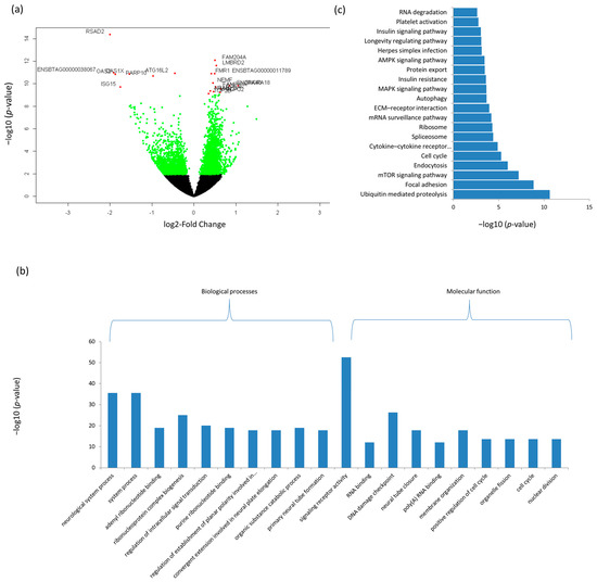 To identify differentially expressed genes, raw read counts of retained transcripts (mRNA or lncRNA) were imported into DESeq2 [48]. DESeq2 normalizes read counts by calculating a size factor for each sample to correct for library size and RNA composition bias. A total of 3310 and 4217 mRNAs were DE between D33 and D96 in Ileum and rumen tissues, respectively (Figure 1a and Figure 2a, Supplementary Table S6a,b). Out of this number, 850 DE mRNAs were common to both tissues (Supplementary Table S6c). The top 20 most significant DE mRNAs are shown in Table 1 and Figure 1a and Figure 2a. Embigin (EMB) and radical S-adenosyl methionine domain containing 2 (RSAD2) were the most significant DE mRNAs for rumen and ileum tissues, respectively (Table 1).