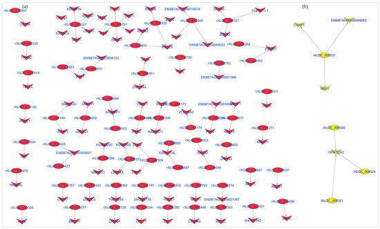 A total of 14 and 525 lncRNAs were significantly DE between D33 and D96 in ileum and rumen tissues, respectively (Table S10a,b). The top significant DE lncRNAs are shown in Table 2. rXLOC_027852 and iXLOC_002882 were the most significant DE lncRNAs in rumen and ileum tissues, respectively. For rumen, 57 out of 525 DE lncRNAs had potential cis roles by correlating significantly with 77 mRNAs (Supplementary Table S10c). Most of the DE lncRNAs had only one potential cis target mRNA while rXLOC_025037 and rXLOC_006791 had the most potential cis target mRNAs (Figure 7). For ileum, 7 out of 14 DE lncRNAs had potential cis regulatory roles, targeting (significant correlation) five different mRNAs (Table S10d) and iXLOC_008931 potentially cis targeted three different mRNAs (Figure 7). Furthermore, one mRNA was the potential cis target of three lncRNAs (iXLOC_009320, iXLOC_009324 and iXLOC009321) in ileum tissue (Figure 7). Some of the potential cis target genes of DE lncRNAs were also significantly DE between D33 and D96 (Table 3 and Figure 7).