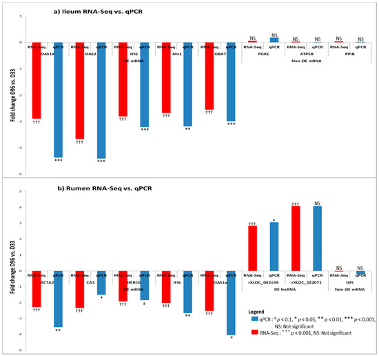 RNA-Seq results were mostly confirmed by qPCR analysis. For ileum samples, observed trend for all nine genes (four housekeeping and five DE genes) was similar to RNA-Seq results (Figure 8a). For rumen samples, the qPCR result was similar to RNA-Seq for four DE mRNAs, two lncRNAs and two housekeeping genes. However, one mRNA only showed a tendency towards significance (HERC6: p < 0.1) by the method of qPCR while one lncRNA (rXLOC_022071) was significantly DE by RNA-Seq but not by qPCR, although the fold change by both methods was the same (4.1-fold change, Supplementary Table S8b). Furthermore, two potential housekeeping genes PGK1 (p = 0.08) and PPIB (p = 0.06) in rumen tissue tended to be DE by the method of qPCR.