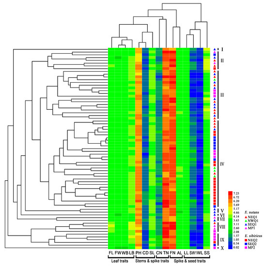 Clustering and Heatmap analysis of the 73 Elymus accessions using fifteen phenotypic traits. All of the 73 Elymus accessions were clustered in ten subgroups. Each line and column represents different accessions and different traits, respectively.