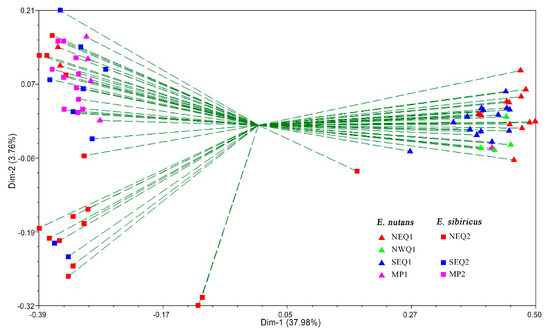 Genetic differentiation (Gst) and genetic distance among the four E. nutans and three E. sibiricus geographical groups were calculated based on Nei’s original measures (Table 4). Among the E. nutans groups, the greatest Gst value (0.37) and genetic distance (0.31) were found between Northwestern Qinghai-Tibetan Plateau (NWQ1) and the Mongolian Plateau (MP1). Among the E. sibiricus groups, the greatest genetic differentiation (Gst = 0.09) was found between Southeastern Qinghai-Tibetan Plateau (SEQ2) and the Mongolian Plateau (MP2).