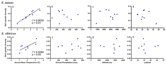 Regression analysis between Nei’s genetic diversity (H) and environmental factors for E. nutans and E. sibiricus. A regression line was fitted only for analyses with p < 0.05.