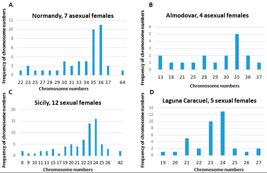 Variation in chromosome numbers in populations of Eucypris virens. (A) asexual 3n females from France, n = 7; (B) asexual 3n females from Spain, n = 4; (C) sexual 2n female from Italy, n = 12; (D) sexual 2n females from Spain, n = 5.