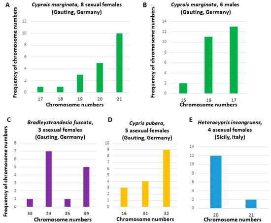 Chromosome numbers in ostracod species of the family Notodromadidae, representing sexually reproducing ostracods, and of the family Cyprinidae, representing asexual and geographically parthenogenetic ostracods. (A,B) a fully sexual species Cyprois marginata, (A) females, n = 8 and (B) males, n = 6; (C–E)/asexual species: (C) Bradleystrandesia fuscata, asexual females (males are unknown in Europe), n = 3; (D) Cypris pubera, asexual females (geographical parthenogenesis with males confined to Turkey), n = 5; (E) Heterocypris incongruens, asexual females (geographical parthenogenesis with males confined to the east of Europe), n = 4.