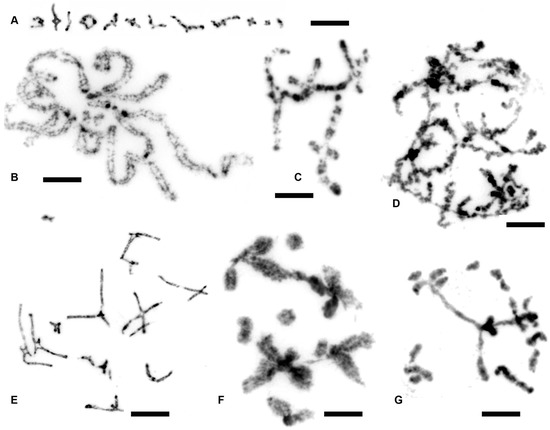 - Schneider, M.C.; Cella, D.M. Karyotype Conservation in 2 Populations of the Parthenogenetic Scorpion Tityus serrulatus (Buthidae): rDNA and Its Associated Heterochromatin Are Concentrated on Only One Chromosome. J. Heredity 2010, 101, 491–496. [Google Scholar] [CrossRef] [PubMed]