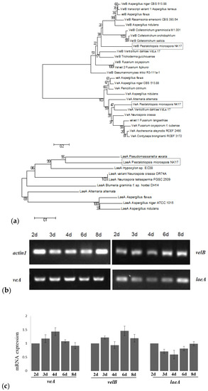 Based on the genome sequence of NK17 (sequenced by BGI, Shenzhen, China; http://www.genomics.cn/index), two velvet-domain-containing proteins and a putative LaeA protein (GME14108_g, GME13740_g, GME5440_g) were identified in P. microspora using the protein basic local alignment search tool BLASTP algorithm (https://blast.ncbi.nlm.nih.gov/). They shared a 62% (E-value 2 × 10−75), 49% (E-value 3 × 10−84), and 47% (E-value 1 × 10−89) sequence identity with the velvet A protein from Neurospora crassa [32], velvet B protein from A. terreus [33], and LaeA protein from Alternaria alternata [34], respectively. Phylogenetic analysis by molecular evolutionary genetics analysis (MEGA) 5.1 software [35] suggested that these proteins respectively clustered with VeA, VelB, and LaeA proteins in other filamentous fungi, supporting the hypothesis that they are VeA, VelB, and LaeA proteins (Figure 1a).