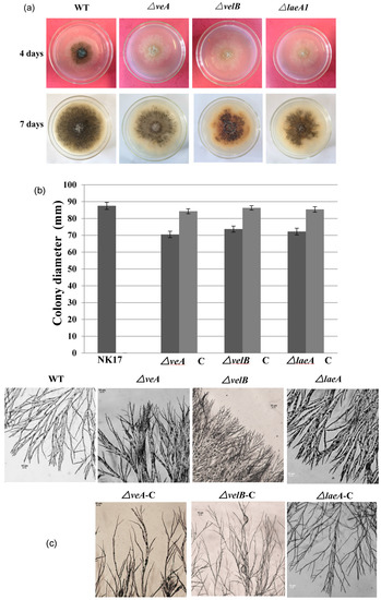 We performed several experiments to observe the phenotype changes in the deletion mutant strains. As shown in Figure 2a, the colony size of the mutants △veA, △velB, and △laeA grown on PLA after a 7-day incubation were distinguishably smaller than that of NK17. Assessment of the growth rate by colony diameters confirmed this observation (Figure 2b). Furthermore, microscopy suggested that the mutant strains exhibited morphological alternation. The hyphal diameter of △veA and △laeA appeared obviously thicker than that of NK17, i.e., 4.86 ± 1.84 μm and 6.25 ± 3.22 μm versus 1.52 ± 0.41 μm of the wild type NK17 (p < 0.01), respectively. Diameter data represent the means of 50 replicates. The △velB and △laeA strains formed denser and more branching hyphae at the periphery of colony on the MM plates. Complementation of the three mutants with corresponding wild-type copy restored the hyphal morphology (Figure 2c).
