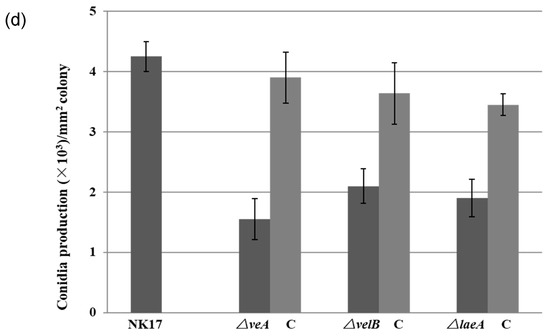 Furthermore, we could also see that the colony pigmentation and conidiation of the mutant strains were dramatically delayed (Figure 2a). We consequently conducted quantification to measure the number of conidia prepared from 8-day-old plates. The mutants △veA, △velB, and △laeA produced about 1.55 ± 0.34 × 103, 2.1 ± 0.39 × 103, 1.9 ± 0.31 × 103 conidia/mm2, respectively, whereas NK17 produced about 4.5 ± 0.25 × 103 conidia/mm2 (p < 0.01). The complemented strains △veA-C, △velB-C, and △laeA-C restored the conidiation to the numbers of 3.9 ± 0.42, 3.64 ± 0.51, 3.45 ± 0.18 conidia/mm2 (p < 0.01), respectively (Figure 2d). The complemented strains also restored the normal growth of the wild-type (WT) NK17 strain (Figure 2d). In addition, the deletion of the three genes delayed the conidiation by approximately one day. We did not observe differences on the hyphal growth and conidiation of the mutants grown in the dark and grown under light conditions. Taken together, the velvet components were required for conidiation and vegetative growth in P. microspora NK17.