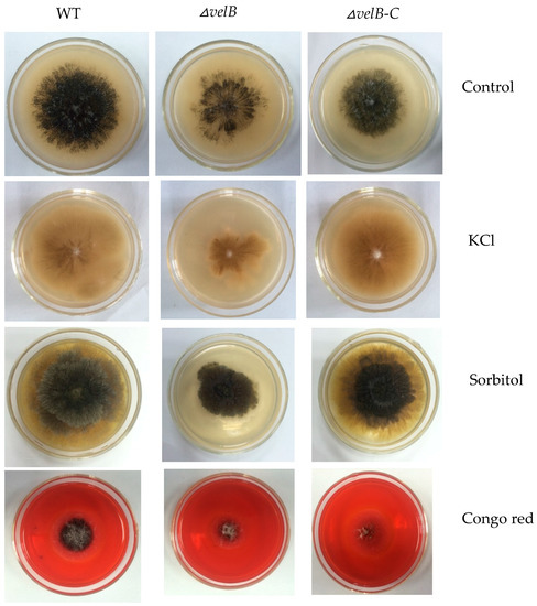 As loss of veA or velB in Fusarium graminearum increases resistance to osmotic stresses and cell wall damaging agent Congo red [37,38], we examined the tolerance in our mutants △veA, △velB, and △laeA to several stress conditions. In contrast, our study showed that the addition of 1 M KCl or 2 M sorbitol to PLA plates led to marked inhibition of growth of △velB through the size of the colony, while the condition showed little effect on the growth of the WT and the complementation strain (Figure 3). This result explicates that velB is required for cellular responses to osmotic changes.