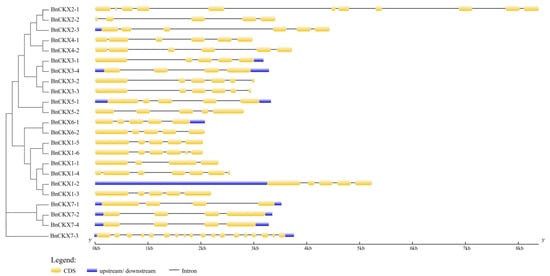 Exon–intron structures of the BnCKX genes according to their phylogenetic relationships. An unrooted phylogenetic tree was constructed with 1000 bootstrap replicates based on the full-length sequences of BnCKX proteins. Exon–intron structure analysis of the BnCKX genes was performed using the online tool Gene Structure Display Server (GSDS). The lengths of the exons and introns of each BnCKX gene are drawn to scale.