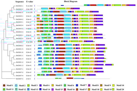 The conserved motifs of the BnCKX proteins according to their phylogenetic relationships. The conserved motifs of the BnCKX proteins were identified by MEME. Gray lines represent non-conserved sequences, and each motif is indicated by a colored box (numbered at the bottom). The lengths of the motifs in each protein are drawn to scale.