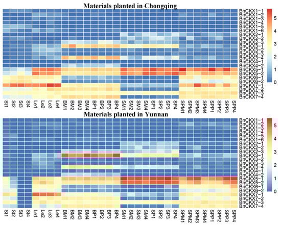 To better understand the characteristics of BnCKX gene expression, we analyzed the expression levels of the 23 BnCKX genes in roots, stems, leaves, buds, flowers, seeds, and silique pericarps at different developmental stages (7S, 7P, 14S, 14P, 21S, 21P, 30S, 30P) by qRT-PCR. The BnCKX genes had diverse expression patterns (Figure 6). Whereas BnCKX1-6, 2-2, 2-3 and 3-4 were not expressed in any tissue examined, the 19 other BnCKX genes exhibited tissue-specific, developmental stage-specific, or ubiquitous expression. For example, BnCKX5-1, BnCKX5-2, and BnCKX7-3 were expressed in all tissues at different levels, while the other genes were only expressed in specific tissues or at specific developmental stages. For instance, BnCKX5-1, 5-2, 7-1, and 7-3 were highly expressed in leaves. BnCKX1-2, 1-3, and 1-4 were highly expressed in flowers. However, the expression patterns of some genes of the same subfamily were inconsistent. For example, BnCKX3-2 and 3-3 were mainly expressed in the silique pericarp, while BnCKX3-1 was strongly expressed in buds. In addition, both BnCKX5-1 and BnCKX5-2 were strongly expressed in 14S and 40S stages but weakly expressed in 21S and 30S. BnCKX6-1 and 6-2 were mainly expressed in 21P, 30P and 40P but were expressed at low levels in 7P and 14P. Finally, BnCKX3-3, 7-3 and 7-4 were highly expressed in 14P, 30P and 40P, respectively. These finding suggest that BnCKX3-3, 5-1, 5-2, 6-1, 6-2, 7-3, and 7-4 might play important roles in the temporal and spatial control of pod development.