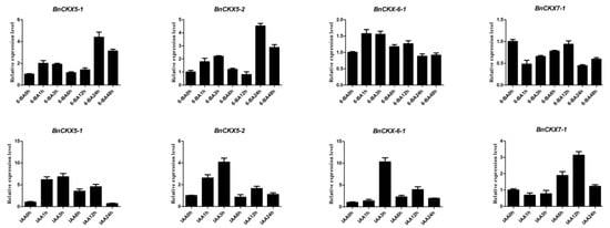 To gain more insight into the roles of B. napus CKX genes in stress responses, we used qRT-PCR to examine the expression of four DEGs in response to treatment with the synthetic cytokinin 6-BA or the auxin IAA (Figure 8). BnCKX5-1, 5-2, and 6-1 were moderately induced by 6-BA. The expression patterns of BnCKX5-1 and 5-2 were similar, both were slightly induced at the beginning of 6-BA treatment and reached a peak at 3 h, followed by a decrease, and another peak at 24 h. Perhaps this phenomenon is related to the complex dynamic balance that shifts after application of the exogenous hormone. By contrast, BnCKX7-1 was downregulated under this treatment. Under IAA treatment, BnCKX5-1 and 5-2 were significantly induced at 3 h, while BnCKX7-1 was slightly downregulated, followed by upregulation, reaching a peak at 12 h, and was again downregulated at 24 h. Compared with 6-BA treatment, IAA more strongly induced BnCKX6-1 expression, with a >10-fold increase in expression at 3 h.