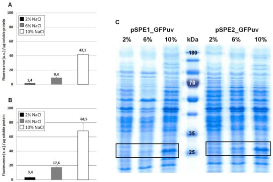 In this case, an almost 50-fold increase can be noticed (growth at 10% NaCl) when compared to Figure 2A (no optimization). The overall fluorescence intensity that is gained by expression with plasmid pSPE2_GFPuv is close to the results that were obtained from pWUB01_GFPuv and pWUB02_GFPuv (Figure 4B and Figure 2B,C), both of which contain an SD consensus sequence. SDS-PAGE gels support these fluorescence data, clearly documenting an increased production of GFPuv with increasing NaCl concentration of the medium (Figure 4C).