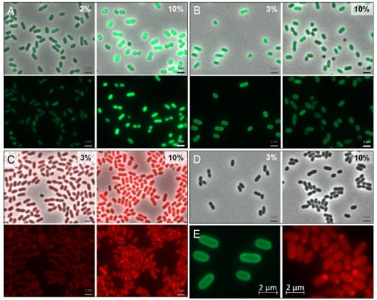 Comparison of cytoplasmic and periplasmic GFPuv expression clearly shows a fluorescent “halo” in respective cells at 3% NaCl (Figure 5B,E, left). This is an indication for the successful transport of GFPuv in an active folded state into the periplasm, mediated by the selected Tat leader peptide. At 10% salinity this effect (although still visible) appears to be less pronounced and it may be due to a congestion of the export system. In cells expressing mCherry, the expected “halo” is not very pronounced. Instead, a polar accumulation of fluorescent proteins can be observed, especially under high salt conditions.