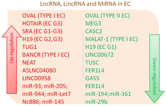 Abnormal expression of several sets of genes is probably the prime mover or a significant factor in the progression of a cancer, and both mechanisms can be at work in sequence. Genetic alterations include both mutational and epigenetic changes, such as methylation, acetylation, and phosphorylation of nuclear chromatin [73,74,75]. Cellular genes are in charge of proliferation, apoptosis, and stem cell differentiation; all of them can undergo epigenetic modifications in cancer [76,77]. The significance of ncRNA is starting to be put under investigation, but more questions than answers are available for now. Is ncRNA a possible marker of cancer risk? Can it be used as a biomarker for tumor diagnosis and as an indicator of tumor progression or of a risk of tumor metastases? Can selective activation or inhibition of RNA pathways help cure or control the aggressiveness of the disease? Are results valid for all cancers? Do some of the promising preliminary results obtained in other conditions apply to EC? Various information-carrying genes have shown important biological and regulatory functions without expressing a translation of their information, such as classically the production of proteins. In particular, lncRNAs show specific and altered expression patterns in EC compared to normal endometrial tissue (Table 1, Figure 1). Some well-known factors associated with EEC show an association with ncRNA expression. Levels of sex hormones are involved in the development of EC. Hormones affect RNAs like lncRNAs SRA, H19 and HOTAIR, and their levels could play a role in the carcinogenesis of EC. Estradiol is an important link between expression of these lncRNAs as it correlates positively with upregulation of H19 and HOTAIR in EC [32,78]. Preliminary in vitro studies showing the reduced growth of EEC cells indicate that a possible new therapeutic pathway for EEC is possible. Study of the mechanisms of expression of RNA in EEC should be pursued, and their effect on cancer growth clarified. lncRNAs could be useful clinical biomarkers of EEC for progression to advanced stages. Hence, lncRNAs could be optimal biomarkers, useful to identify patients at high risk for progression to advanced stage, and the profiling of lncRNAs could actually offer improved diagnostic accuracy.