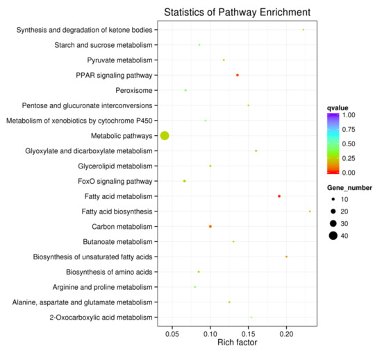 In order to determine molecular pathways involved in the generation of fatty liver, GO and KEGG pathway analyses were performed with the DEGs. As shown in Figure 7 and Figure 8, there was significant enrichmentof the fatty acid metabolic and biosynthesis pathway (gga01212, gga00061, gga01040, GO:0006631, GO:0006633), lipid metabolic pathway (GO:0008610, GO:0044255, GO:0006629), PPAR signaling pathway (gga03320) and FoxO signaling pathway (gga04068).