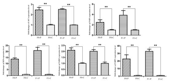 Fold changes of fatty acid metabolism genes (ACC, FASN, SCD, FADS2) and lipid metabolism gene (FABP1) expression levels between P (paternal inheritance group) and C (control group) in F0 and F1 generations. ** indicates p < 0.01.