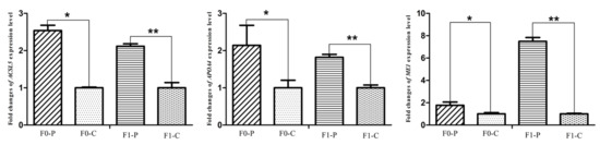 Fold changes of fatty acid metabolism gene (ACSL5), lipid metabolism gene (APOA4) and glucose metabolism gene (ME1) expression levels between P (paternal inheritance group) and C (control group) in the F0 and F1 generations. * indicates p < 0.05 and ** indicates p < 0.01.