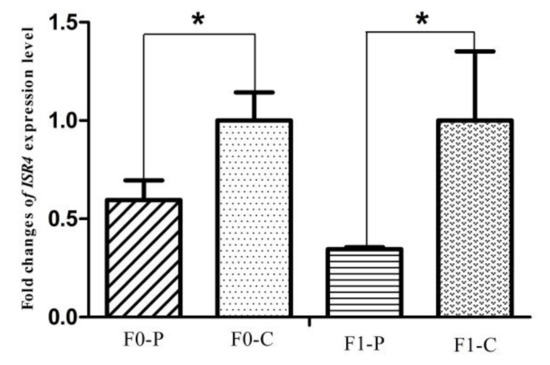 Fold change of glucose metabolism gene, ISR4, expression level between P (paternal inheritance group) and C (control group) in the F0 and F1 generations. * indicates p < 0.05.