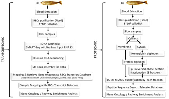 In this manuscript we show a combined transcriptomic and proteomic evaluation of rainbow trout nucleated RBCs (see Figure 1 for a representative schema of the procedure). In order to achieve this, we performed RNA-sequencing (RNA-seq) and label-free shotgun proteomic analyses of RBCs pooled from eight fishes. For transcriptome profiling, a de novo assembly of rainbow trout RBCs was conducted to create a transcriptome database for RBCs gene mapping. For proteome profiling, we developed a novel proteomic analysis method that combined: (a) fractionation into cytosolic and membrane fractions, (b) hemoglobin removal of the cytosolic fraction, (c) protein digestion, and (d) a novel step with pH reversed-phase peptide fractionation and final Liquid Chromatography Electrospray Ionization Tandem Mass Spectrometric (LC ESI-MS/MS) analysis of each of the fractions.