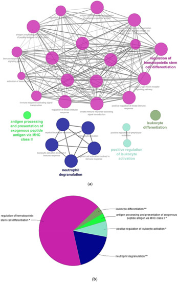 Cytoscape pathway network of significantly over-represented Immune System Process Gene Ontology (GO)-terms in RBCs transcriptome and proteome profiling common genes and proteins. (a) Pathway network. Each node represents a GO-term from Immune System Process. Node size shows GO-term significance (p value): smaller p value, larger node size. Edge (lines) between nodes indicate the presence of common genes: thicker line implies a larger overlap. GO-terms are classified into several function groups (different node color). The label of the most significant GO-term for each group is highlighted. (b) A pie chart of Immune System Process function groups. Asterisks denote GO-term significance. Functional groups are labelled as follows: Dark pink = regulation of hematopoietic stem cell differentiation, dark blue = neutrophil degranulation, light blue = positive regulation of leukocyte activation, light green = antigen processing and presentation of exogenous peptide antigen via MHCII, and dark green = leukocyte differentiation. A list of all over-represented terms and statistics is provided in Table S2.