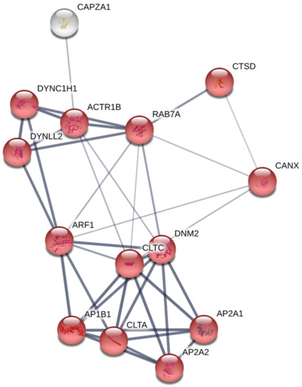 RBCs transcriptome profiling identified 14,008 genes, from which 13,937 genes were considered expressed since they were detected above a threshold of 10 reads mapped. Table 1 shows statistics of de novo assembly, RNA-seq raw data and mapping. Conversely, proteome profiling identified 1.770 proteins, where 724 proteins had more than 2 PSMs. Among those genes with more than 10 gene reads and proteins with more than 2 PSMs and 670 genes and proteins (Table S1), were common to both transcriptome and proteome profiling respectively (Figure S2). A Cytoscape pathway enrichment analysis, with Immune System Process GO-terms, was performed in order to evaluate functionally grouped GO-terms and pathway annotation networks which are mainly represented in rainbow trout nucleated RBCs immune response. Results showed five strongly represented networks of interest: (i) regulation of hematopoietic stem cell differentiation, (ii) neutrophil degranulation, (iii) positive regulation of leukocyte activation, (iv) antigen processing and presentation of exogenous peptide antigen via MHCII, and (v) leukocyte differentiation (Figure 2a,b, Table S2). Subsequently, an interactome network was built for each GO-term set of proteins, to identify protein-protein interactions, and predict functional associations. We found that proteins grouped in antigen processing and presentation of exogenous peptide antigen via MHCII network highly interacted with each other (Figure 3), with a FDR p value 1.37 × 10−27 and PPI enrichment p value < 1.0 × 10−16. Fourteen proteins identified in this GO-term were: ACTR1B (ARP1 actin related protein 1 homolog B), AP1B1 (adaptor related protein complex 1 beta 1 subunit), AP2A1 (adaptor related protein complex 2 alpha 1 subunit), AP2A2 (adaptor related protein complex 2 alpha 2 subunit), ARF1 (ADP ribosylation factor 1), CANX (calnexin), CAPZA1 (capping actin protein of muscle Z-line alpha subunit 1), CLTA (clathrin light chain A), CLTC (clathrin heavy chain), CTSD (cathepsin D), DNM2 (dynamin 2), DYNC1H1 (dynein cytoplasmic 1 heavy chain 1), DYNLL2 (dynein light chain LC8-type 2), RAB7A (member RAS oncogene family). Moreover, the expression of these genes was corroborated in a single-cell sorted RBCs RNA-seq. Gene reads are indicated in Table S3. Besides, MHCII gene reads were detectable in single-cell sorted RBCs RNA-seq (Table S3).