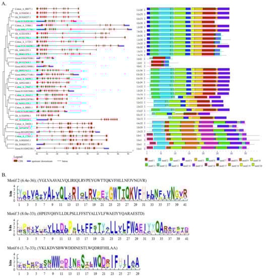 (A) Phylogenetic tree, gene structure, and motif of all the cotton TOM genes. Red colour indicates the exons, blue indicates the up/downstream, and the grey lines are the introns. The motifs are numbered 1 to 20 and are illustrated by differently-coloured motifs unique to cotton TOM genes; (B) Common motifs which define the cotton-specific TOM gene.
